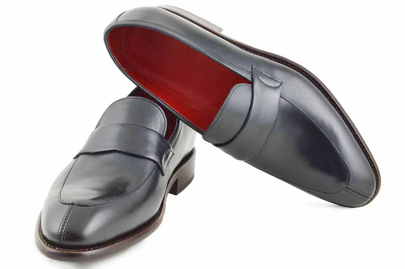 Zapato realizado en piel flor azul, forrado completo en piel vacuno rojo, suela de cuero y goma y fabricado en cosido Goodyear. Calce confortable y de apariencia alargada.