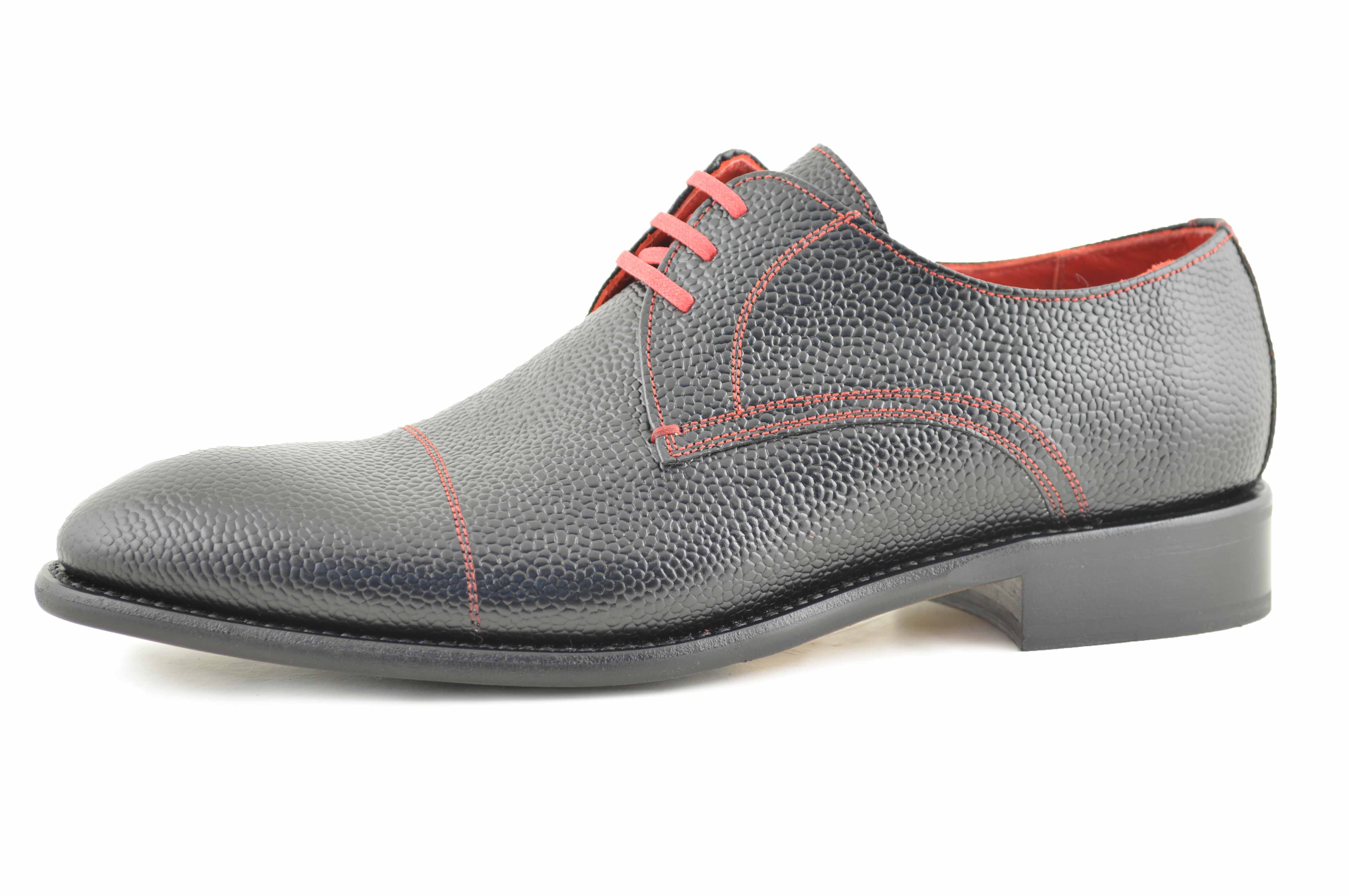 Zapato realizado en piel grabada verde oscuro, forrado completo en piel vacuno, con suela de cuero y fabricado mediante proceso de cosido GoodYear. Horma confortable de apariencia alargada.