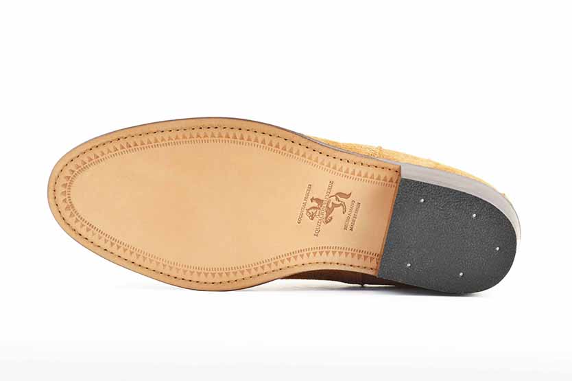 Moldeada con elásticos, un clásico, fabricada en ante camel con forro de piel satinado y suela de cuero.